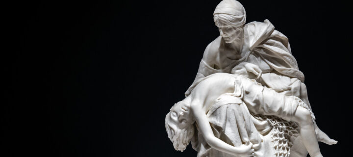 Après la tempête (After the Storm) depicts a Breton peasant woman cradling the body of her grandson who had been caught in a fisherman’s nets. Sarah Bernhardt had seen this woman on the seashore and was moved by her story, which ended tragically with the death of the child. But in Bernhardt’s sculpture the child’s right hand grips the woman’s garment, perhaps suggesting the possibility of a more hopeful ending.