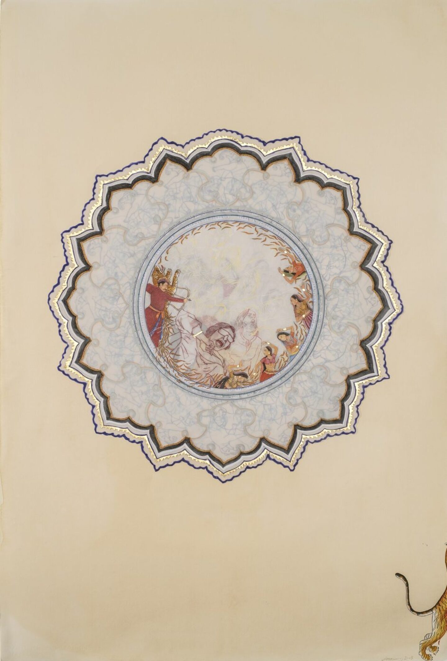 Ambreen Butt’s mornings and masterpieces begin the same way: with tea. A staple in traditional Persian miniature painting, tea staining serves as the foundation for many of her works on paper. Butt prefers loose leaves to bags and fine-tunes her steeping time to produce just the right hue. Unlike her work’s later layers, which need an exacting, meticulous touch, the tea-staining process calls for big gestures: Butt uses her whole body to cover her canvas in a free-form style.