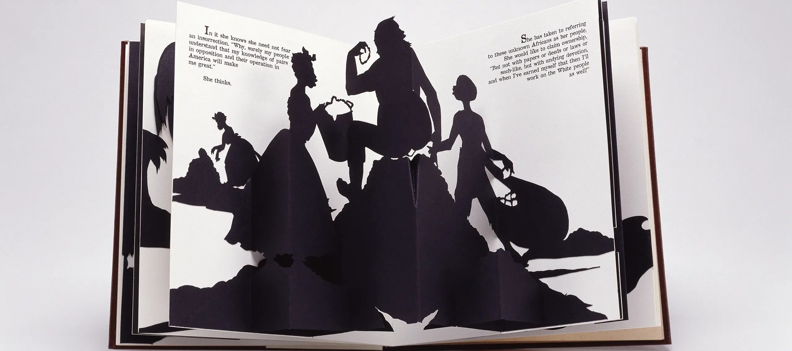 Walker often includes writing and storytelling in her artwork. Her pop-up book Freedom, A Fable: A Curious Interpretation of the Wit of a Negress in Troubled Times (1997), part of NMWA’s artists’ book collection, tells the story of a former enslaved woman. And in 2001, Walker created a series of short, diary-like writings on index cards that were exhibited in American Primitive at Sikkema Jenkins & Co. One card reads, “We are Superman. Venus, Oprah, Toni, Angela, Tina, Serena, Kara…We End in Vowel sounds and Our names Last Forever when you speak them aaah!”