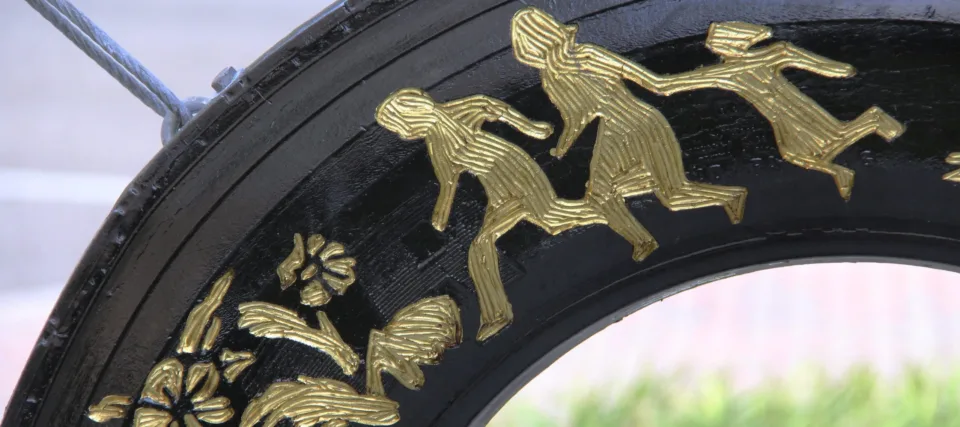 Unlike Chakaia Booker (b. 1953), who manipulates tire pieces to compose monochromatic sculptures like Acid Rain (2001), Romero transforms and beautifies intact tires—piercing, incising, and gilding their side walls and tread. Her use of car and truck tires reference urban life, transportation, consumption, and pollution, while tractor tires allude to rural labor, farming, and cycles of cultivation.