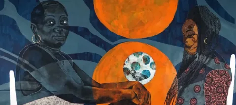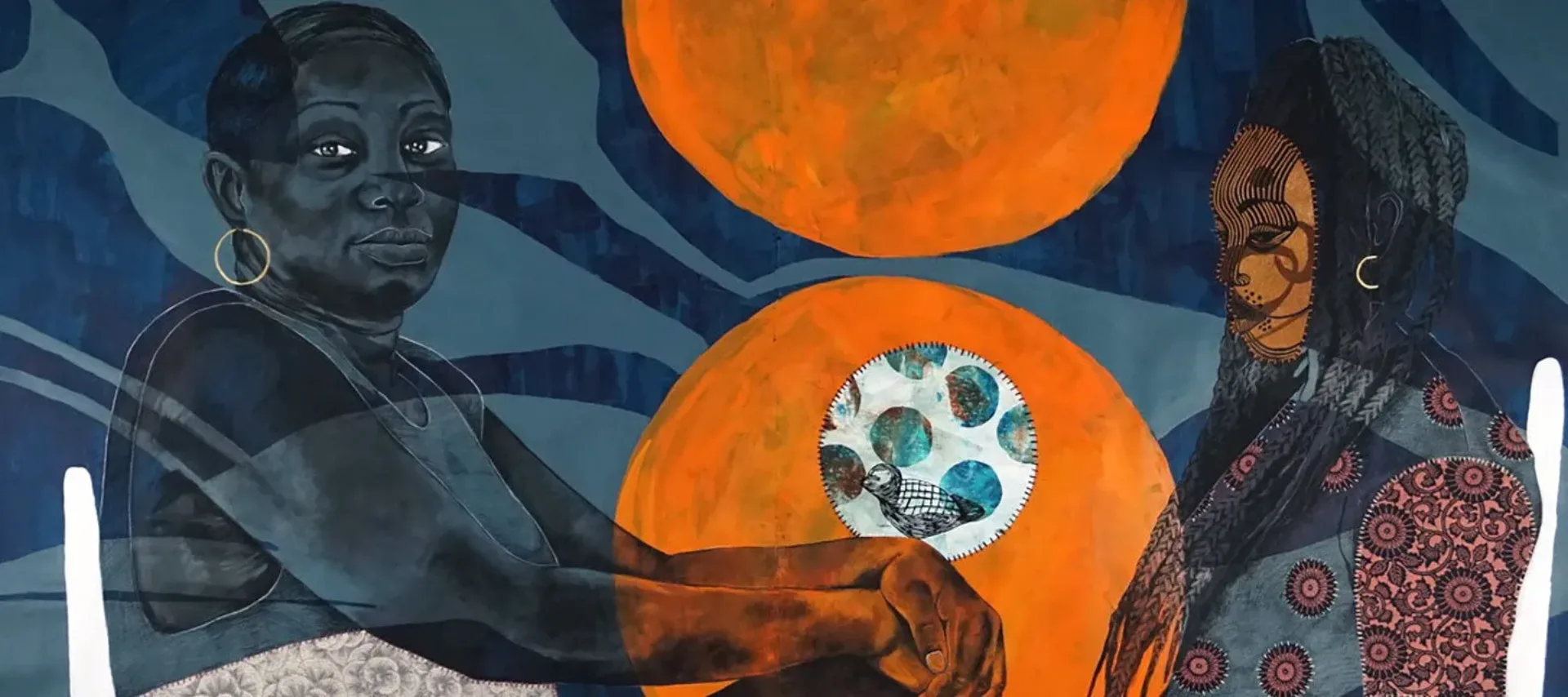 A mixed-media work shows two seated figures facing each other; the first woman sits cross-legged staring confidently out at viewer while the second woman is masked and gazes elsewhere. In the background blue abstract shapes with two orange orbs fill the space between them.