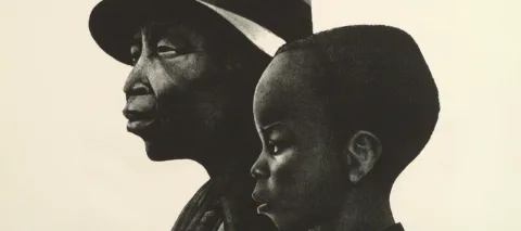 Another University of Iowa classmate, writer Margaret Walker (1915–1998), became a lifelong friend. In 1992, Catlett created six lithographs illustrating Walker’s poem For My People to honor the publication’s 50th anniversary. The Limited Editions Club produced 400 folios pairing Walker’s words with Catlett’s images.