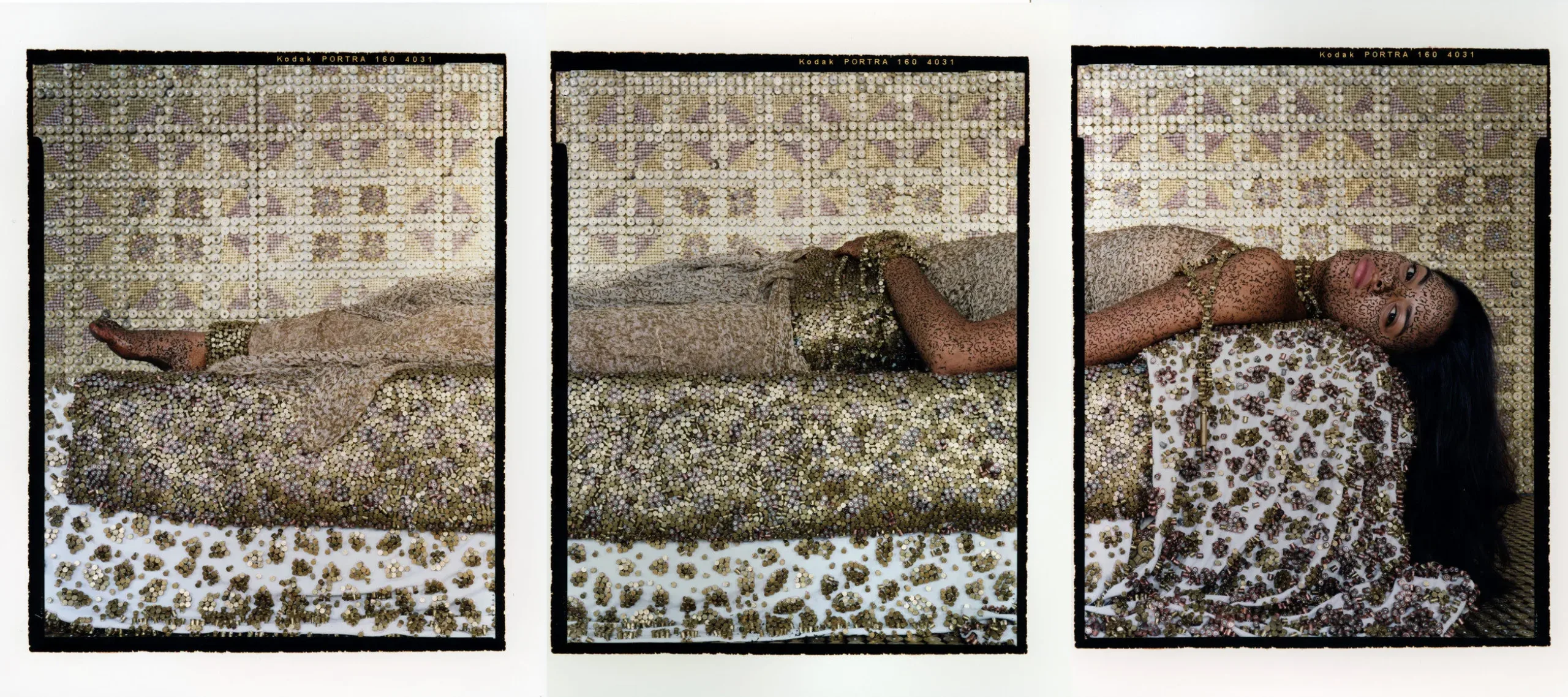 At the center of the glittering scene in Bullets Revisited #3 is a model whose skin and dress are covered in henna, which Essaydi applies using a syringe. The artist often works with family acquaintances and they discuss, agree on, and rehearse all aspects of the image before the shoot. The multi-hour process—eased by music and storytelling—requires patience and stillness from Essaydi’s collaborators.