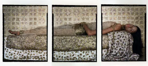 Essaydi admires 19th-century Orientalist paintings for their beauty —but not their false narratives. To challenge these representations, she identified three main themes, “the harem, the veil, and the odalisque,” and adopted them throughout her work. Bullets Revisited #3 evokes the odalisque—a seductive female nude—but subverts the voyeuristic tradition with the segmented body and returned gaze.