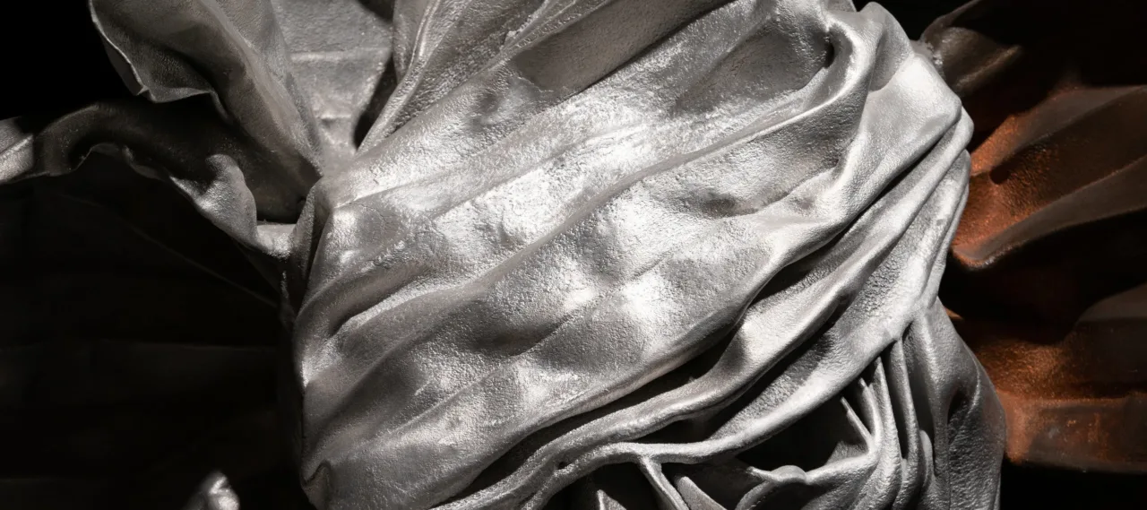 In 1972, Benglis began a series of “knot” sculptures. The artist manipulated hard metals and wires into forms that are reminiscent of decorative elements of women’s clothing, such as bows and ruffles. Eridanus (1984), named after a river in Greek mythology, features pleated sheets of bronze, zinc, copper, and aluminum twisted into the shape of a knot. Some interpret this work as a feminist representation of Benglis’s own physical strength, a reflection of the manual labor required to twist and bend harsh materials into such forms.