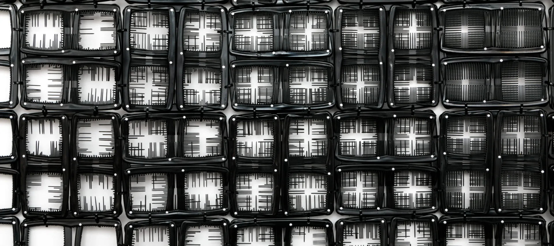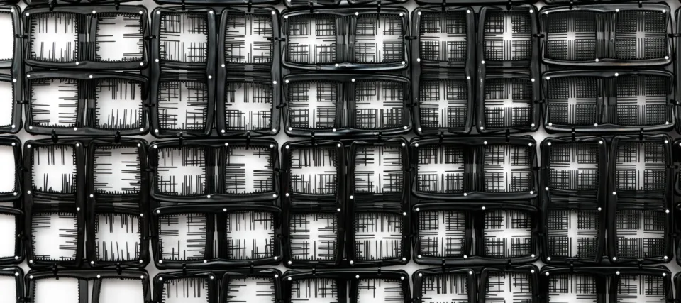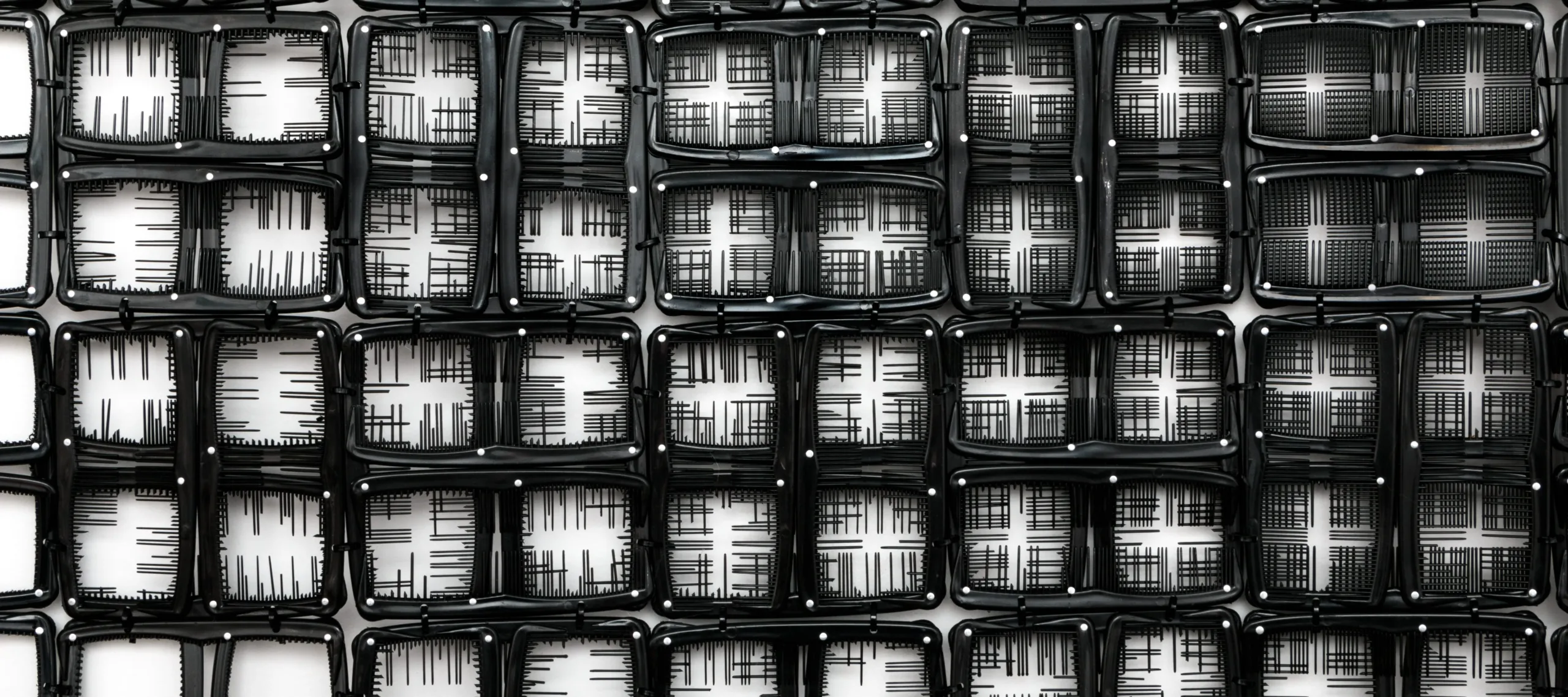 Clark uses fine-tooth combs, originally made for white hair, in unexpected ways. She teases out conversations about “hair culture, race politics, and antiquated notions of good hair and bad hair.” Clark reinvents combs as looms for woven patterns and phrases; meandering tendrils; sculptural curls; and larger-than-life portraits to honor Black experience and figures like Madam C. J. Walker and Ntozake Shange.