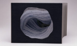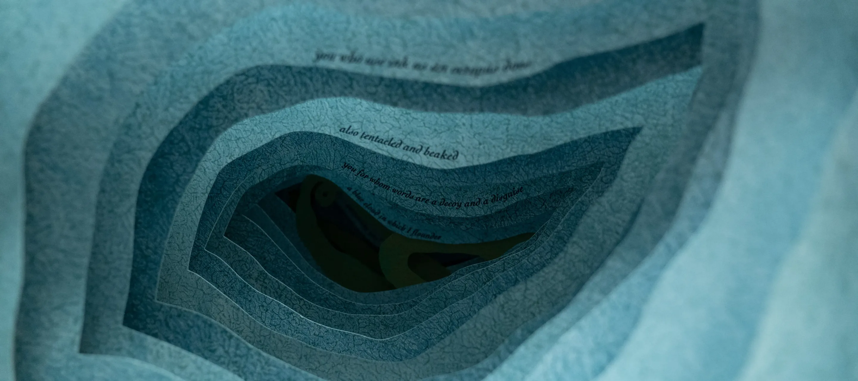 As you peer through this tunnel book by Julie Chen (b. 1963) to read Elizabeth McDevitt’s words, the receding text mirrors the growing distance between two people described in the poem. The speaker likens the other’s defensive behavior to that of an octopus, and a close look reveals the creature’s tentacles emerging from the sea-hued, wave-like pages.