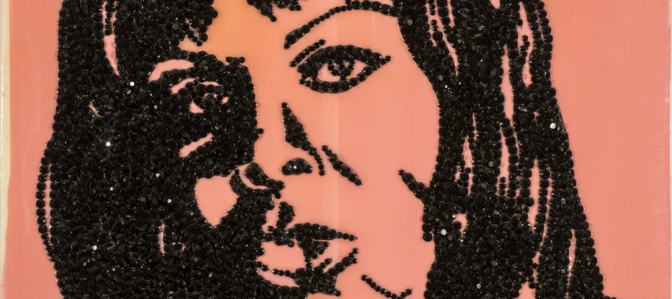 An enamel portrait painting of a woman made with encrusted black rhinestones glued to shiny pink acrylic background.