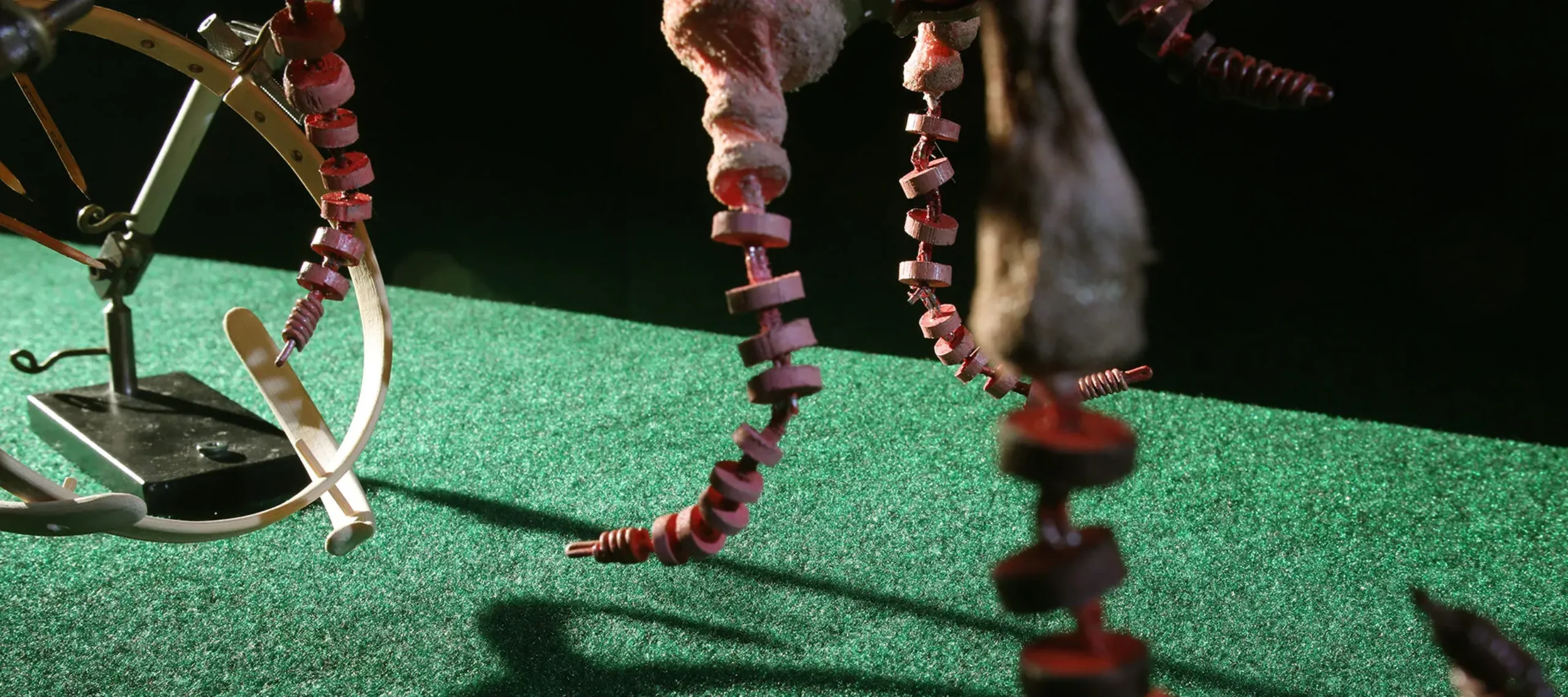 In this screen still from a puppet stop motion animation, miniature sculptures made from wood, metal, and other materials are arranged on top of, and hang above, green turf, set against a pitch black background. The sculpture's shadows appear on the turf. The sculptures are made up of various circular designs.