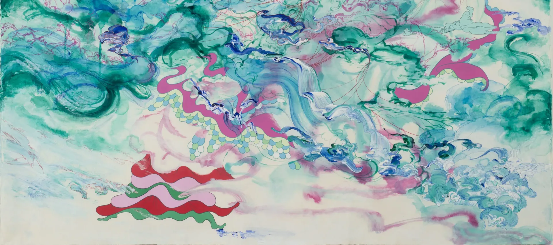 As a “cartographer of cultures,” Jiha Moon strives to be “a visual interpreter of the mixed cultural worlds of [her] generation.” The Atlanta-based artist creates kaleidoscopic works of art that reference map-making practices, traditional Asian landscape paintings, and Western pop-culture iconography. She refers to her dynamic compositions, layered with gestural brushstrokes with surrealistic forms, as “mind-scapes.”