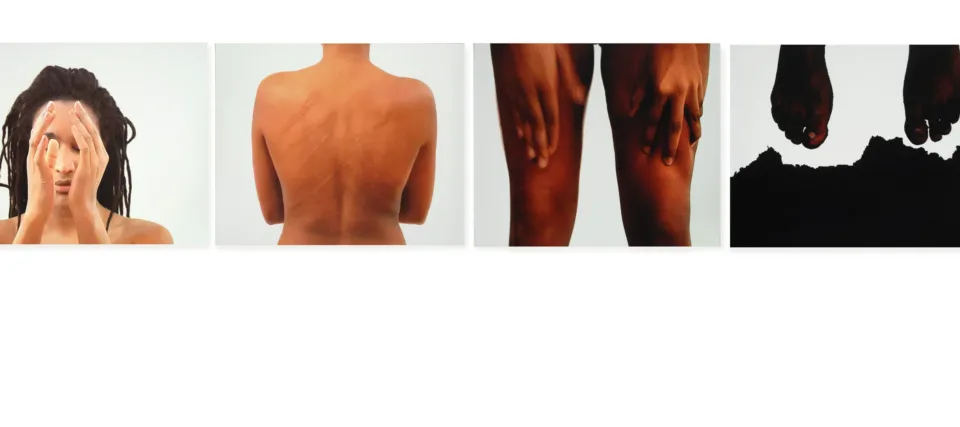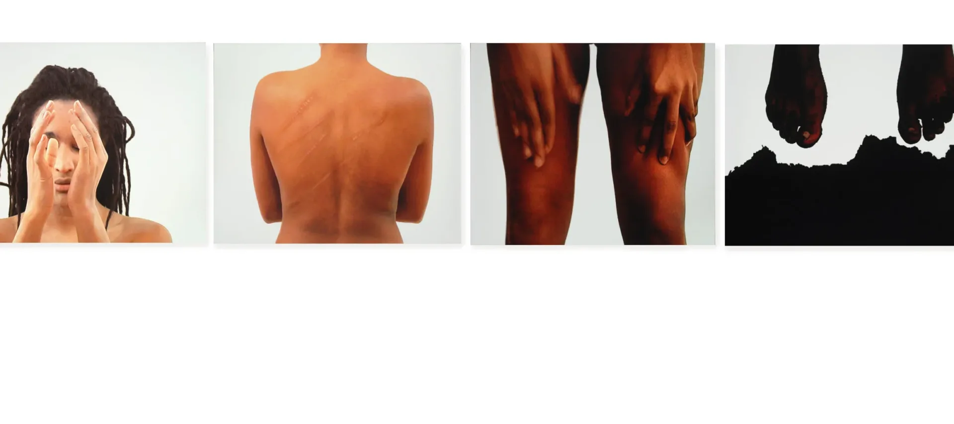 Each still is a close-up section of Mwangi’s body: her head, back, thighs, and dangling feet. As the series progresses, the skin tone darkens against the unchanging, clinical-feeling, neutral background. The subtle details in each still lead to a collective tension—the hands in prayer, scars on the back, one hand grabbing a thigh, and feet hovering over what seems to be a rough coastline (actually a cloth). The scars in particular reference not only the strained relationship between European countries and their former colonies but also African scarification rituals.