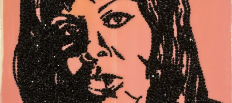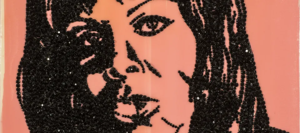 Thomas’s painting in NMWA’s collection, A-E-I-O-U and Sometimes Y (2009), is an example of the artist’s exploration of art history, Blackness, and womanhood. At a glance, the portrait appears to be silkscreened like Warhol’s famous prints, but a closer look reveals individually placed Black rhinestones that constitute the subject’s hair and facial features. Upon inspection, brushstrokes are visible against the work’s vibrant pink background, and viewers can detect subtle differences in hue. Incorporating popular culture, Thomas often titles her works after songs. The title A-E-I-O-U and Sometimes Y references a 1983 dance-club hit single by Ebn-Ozn.