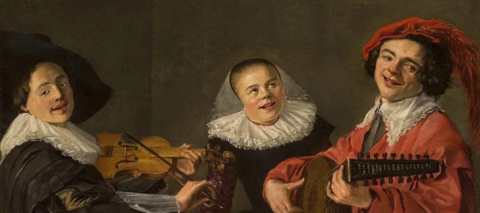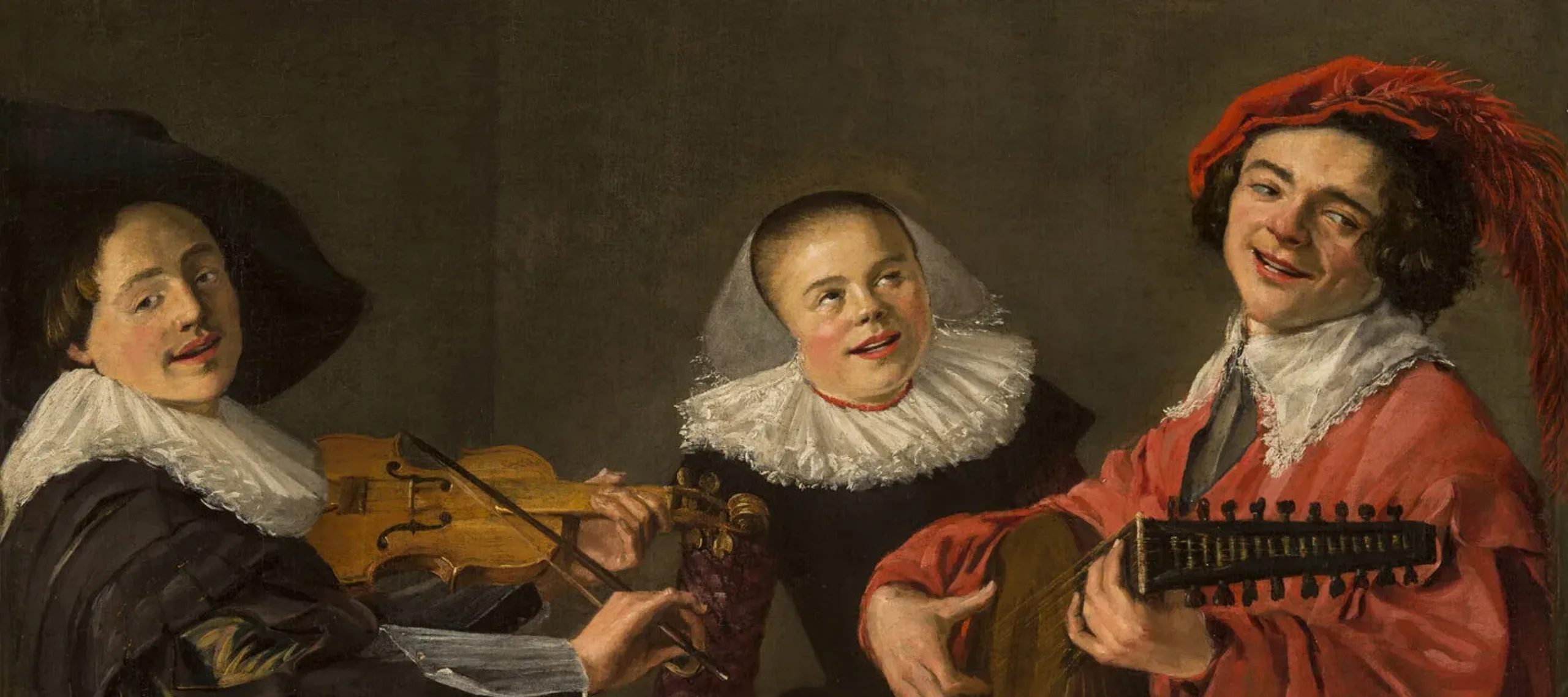 Painting of a trio of smiling musicians. On the left, a man wears a large black hat and plays the violin. On the right sits a man in orange wearing a feathered hat and playing the mandolin. In the center sits a woman dressed in black, opening her mouth in song.