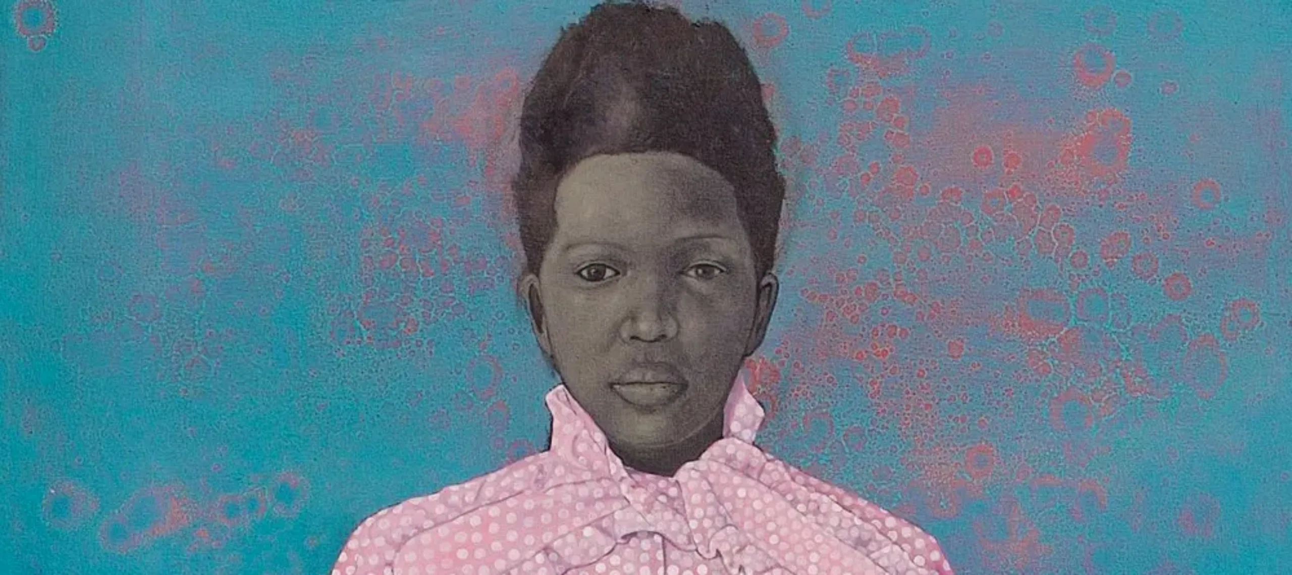 The painting, on loan to NMWA through September, is Well Prepared and Maladjusted (2008), by Amy Sherald (b. 1973). Sherald considers it a pivotal work in her career, and it began with a chance encounter. When Sherald met her subject, the artist was working in Baltimore, and the model was a curatorial intern at the city’s Walters Art Museum. Drawn to her height, hairstyle, and overall look, Sherald chose to depict the woman in the outfit she was wearing that day. According to Sherald, “She was 6’3” and had on this polka-dot outfit from a second-hand store . . . I saw my story in her.” While Sherald painted, a poet wrote about her work as part of a program through the Studio Museum in Harlem. Once they were both done, Sherald found the perfect title for the painting from the poem’s lines.