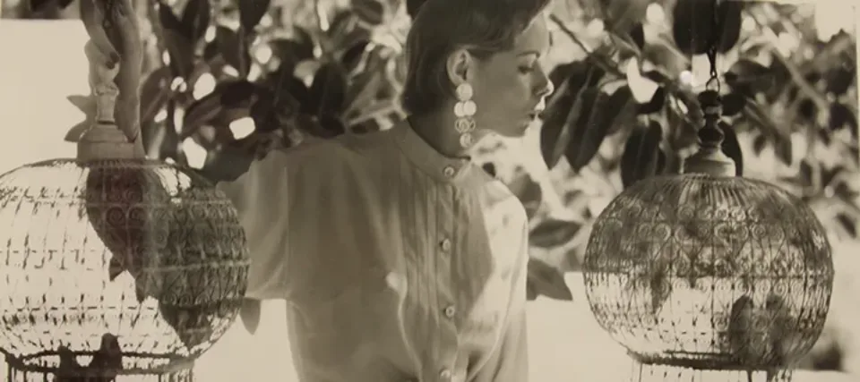 In her photograph Natalie with Birdcages (1950), the belted silhouette of the model echoes that of the two hanging cages, creating a harmonious composition in which the model appears at one with her surroundings. This mimicry emphasizes the naturalism of the model and the “wearability” of the clothing, a technique that Dahl-Wolfe used in other photographs like this one. Contemporary critics have praised the photographer for “replac[ing] the image of the glamorous goddess in the gilded cage with an approachable, active woman with a sense of self”—a sentiment apt for this image of a woman positioned outside of a cage, existing freely and at ease in the world.