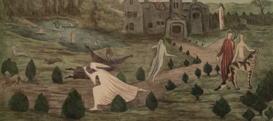 As a painter, sculptor, and writer, Carrington’s works integrate imagery from disparate cultural sources. Inspired by Mayan folklore, Celtic legends, Tibetan Buddhism, alchemy, and the occult, her otherworldly works are both eerie and whimsical. Chimeric figures often animate her complex interiors and magical landscapes.