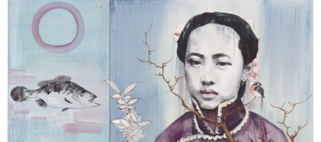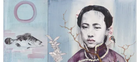 Liu’s best-known works are paintings based on historical photographs. Re-creating the images in an enlarged format, she transforms humble documents into large, vivid portraits. Perhaps in rebellion against her training, Liu rejects the rigid realism of Chinese art of the post-Mao era. Instead, she embraces traditional conventions of Chinese painting that value energetic, expressive line work. She uses a restorative process in her work, layering bright colors over the black-and-white original images as well as decorative textures and whimsical forms from classical paintings. She often drips linseed oil over the canvas to create a hazy veil that hints at the muddled refractions of history and memory. By focusing on her subjects, Liu dignifies and humanizes these nameless faces of history. In lieu of capturing their precise historical context, she enhances the mysterious aura lent to them by the passage of time.