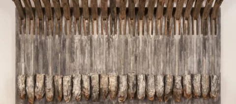 The Contour of Feeling centers on the creative flourishing of the artist’s recent career, anchored by a number of her early masterpieces. Among these is Untitled (nine cones) (1976), von Rydingsvard’s first major work in cedar and the earliest work on view in this exhibition. Subtle references to her family history are seen in Zakopane (1987), a wall installation of 22 fused vertical units with hollow vessels at the base. The sculpture commands the viewer’s attention with an altar-like presence that simultaneously recalls the tools used for labor by Polish peasants.