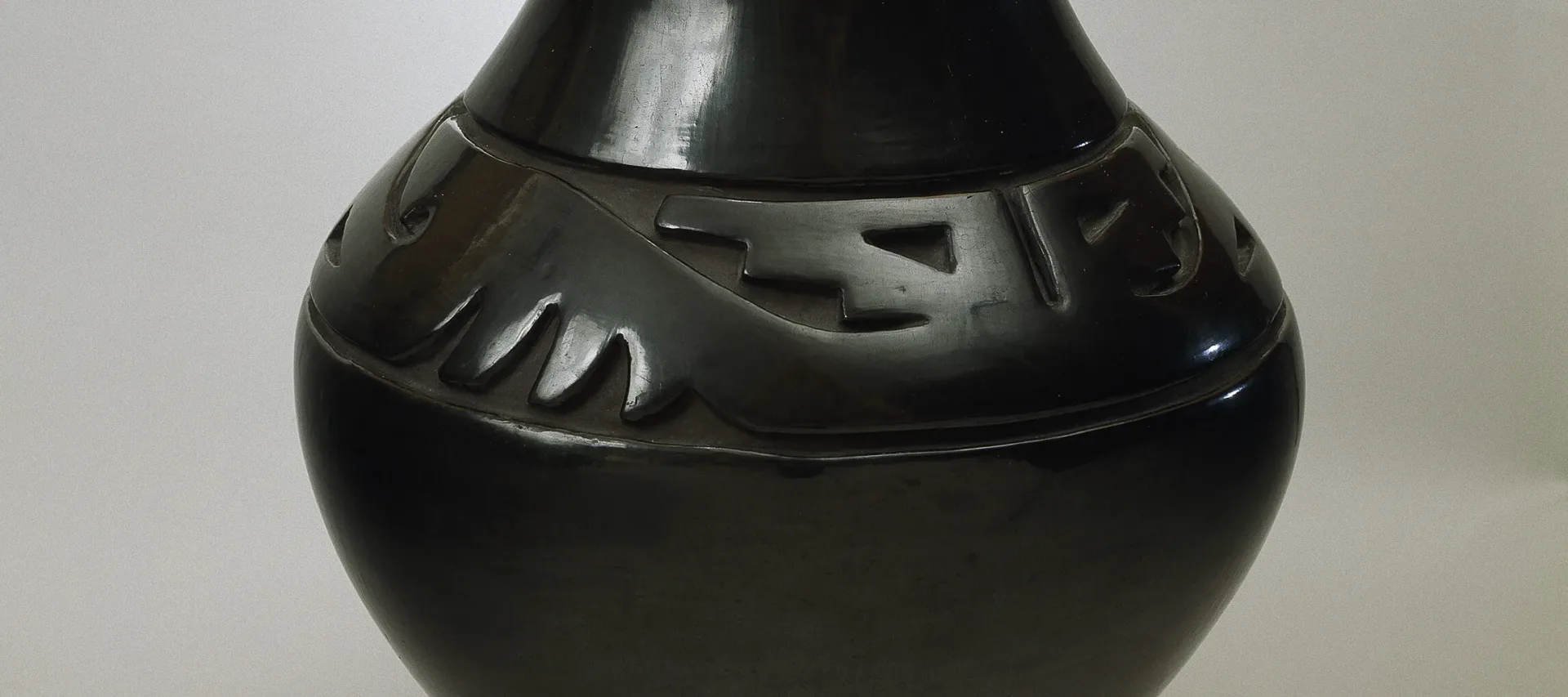 Tewa artist Margaret Tafoya (1904–2001) spent her entire life in the Santa Clara Pueblo near Santa Fe, New Mexico. Her name in the Tewa language means “Corn Blossom.” Tafoya was the last of the matriarchs of the early 20th-century pueblo potters. The Santa Clara Pueblo pottery tradition dates back to 500 CE, when the community developed agriculture and adopted a more settled lifestyle. In this culture, pottery was traditionally made by women. Tafoya was heir to this longstanding cultural tradition. She followed in her mother’s footsteps and passed down the knowledge of pueblo pottery to her children and grandchildren. Her work reflects the shift of the Santa Clara Pueblo pottery tradition from solely utilitarian to artistic. Tafoya also continued in her mother’s style of creating exceptionally large vessels.