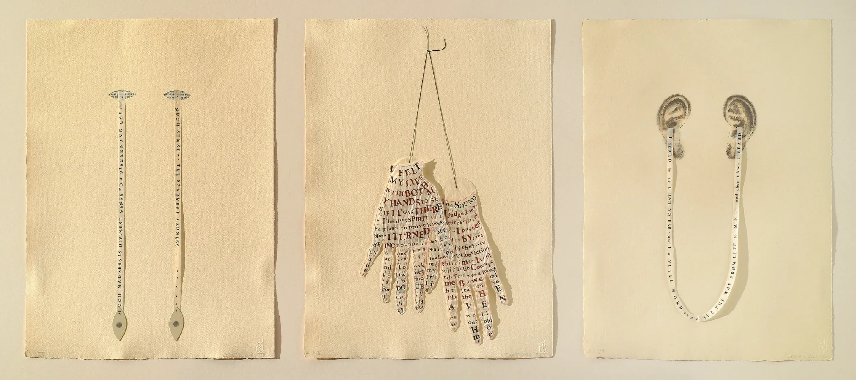 Lesley Dill combines the human body, language, and a range of materials to construct her artwork. The Poetic Body–Gloves, Ears, and Eyes, 1992, exemplifies this practice. It can be seen in The Collaborative Print: Works from SOLO Impression at NMWA through September 13.