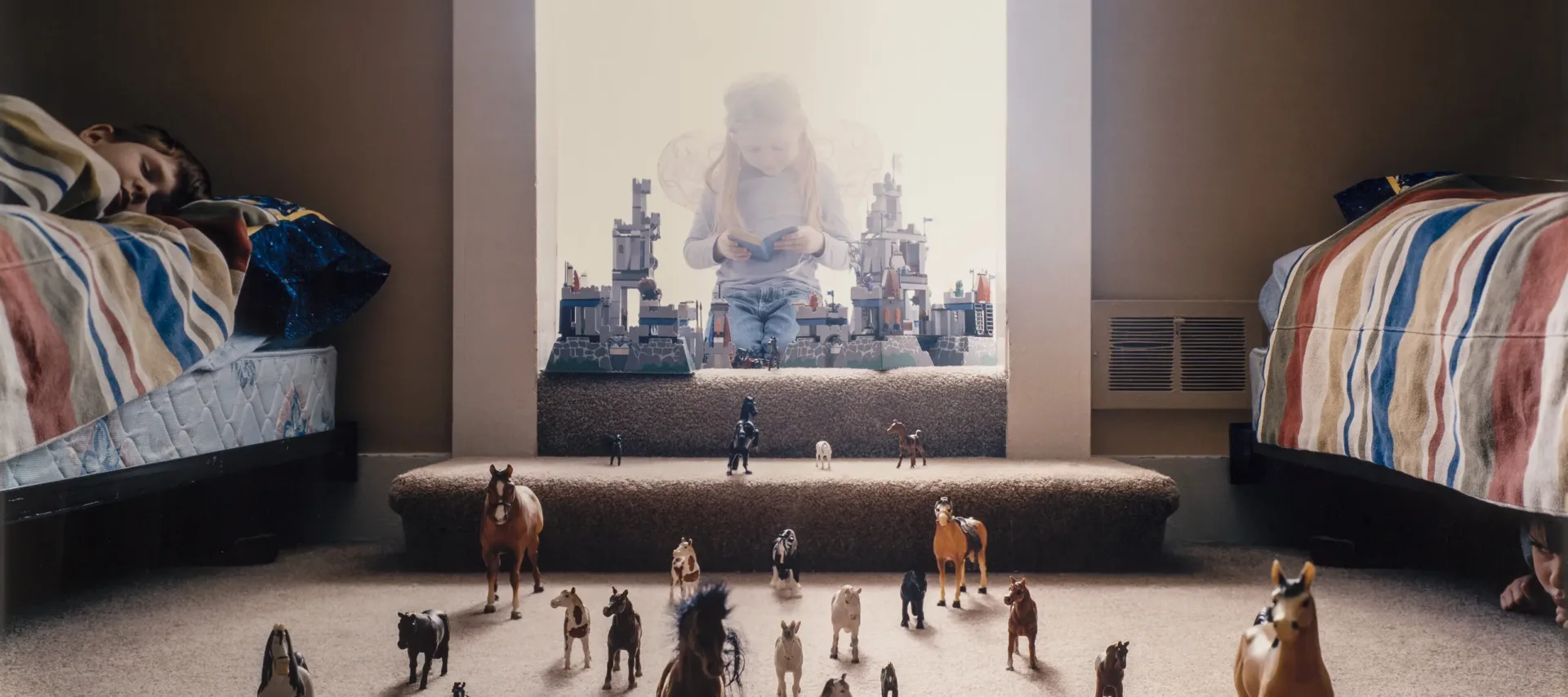 Untitled (Horses) (2004) from “Left Behind” incorporates dread and humor in a playful image. The series’ title refers to the Christian concept of the apocalypse: that true believers will be raptured into heaven while the unsaved will remain on Earth for a period of chaos and violence. In the photograph, toy horses (a reference to the apocalypse) seem to flee from a young girl who is bathed in light, wearing costume wings, and reading a small Bible. To her right, a boy sleeps peacefully, while another child lurks underneath the bed to her left.