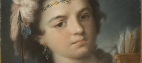 The realistic flesh tones of the figure exemplify Carriera’s skill with pastel. She included a jeweled headband, feather hair accessory, and a quiver of arrows to allude to Europeans’ common associations with America. Her ability to capture the textures of rich fabrics and accessories was appealing to her wealthy patrons.