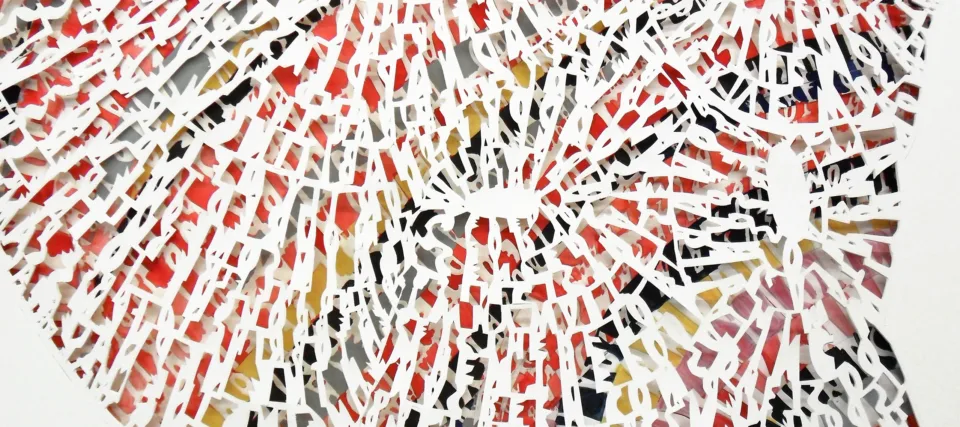 Contrariwise (2011) depicts two symmetrical skull-shaped forms facing each other. Thousands of small cuts in the shapes of letters reveal a deeper layer of paper painted in blue-black, bright red, mustard yellow, and gray. The cut letters are a transcription of the dialogue spoken between Tweedledee and Tweedledum in Lewis Carroll’s Through the Looking-Glass (1871). Bowdoin says, “Carroll’s text dissolves and regenerates in the guise of twin chattering skulls, blurring the boundary between looking and reading. Paper allows for the element of transformation that is crucial to all that I make.”
