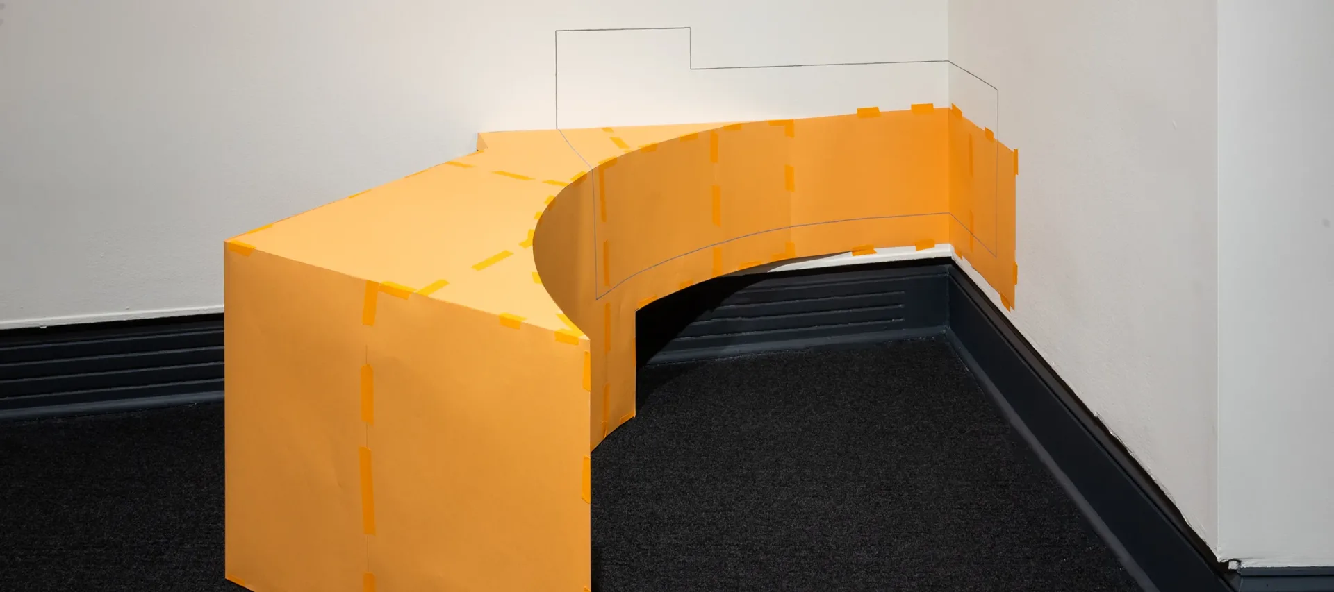 I began using paper to build full-scale prototypes of my cast concrete sculptures. These paper models were only intended to serve a practical purpose, but I found they had several compelling sculptural qualities distinct from those of my concrete pieces. Paper can create volume without mass, for instance, and evoke the imaginary space of an architectural model. I wanted to turn my prototyping process into an end in itself, so I started making site-specific temporary paper sculptures that integrate into the gallery space. The simple processes of cutting, folding, and taping allow me to work quickly and intuitively and also offer the viewer easy mental access to the work’s construction and improvised composition.