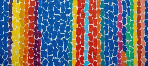 Abstract painting composed of brightly colored, lozenge-shaped brushstrokes in vertical stripes of navy, purple, turquoise, yellow, orange and red.The overall effect is as if the painting was collaged out of torn pieces of paper, with the white of the canvas showing through.