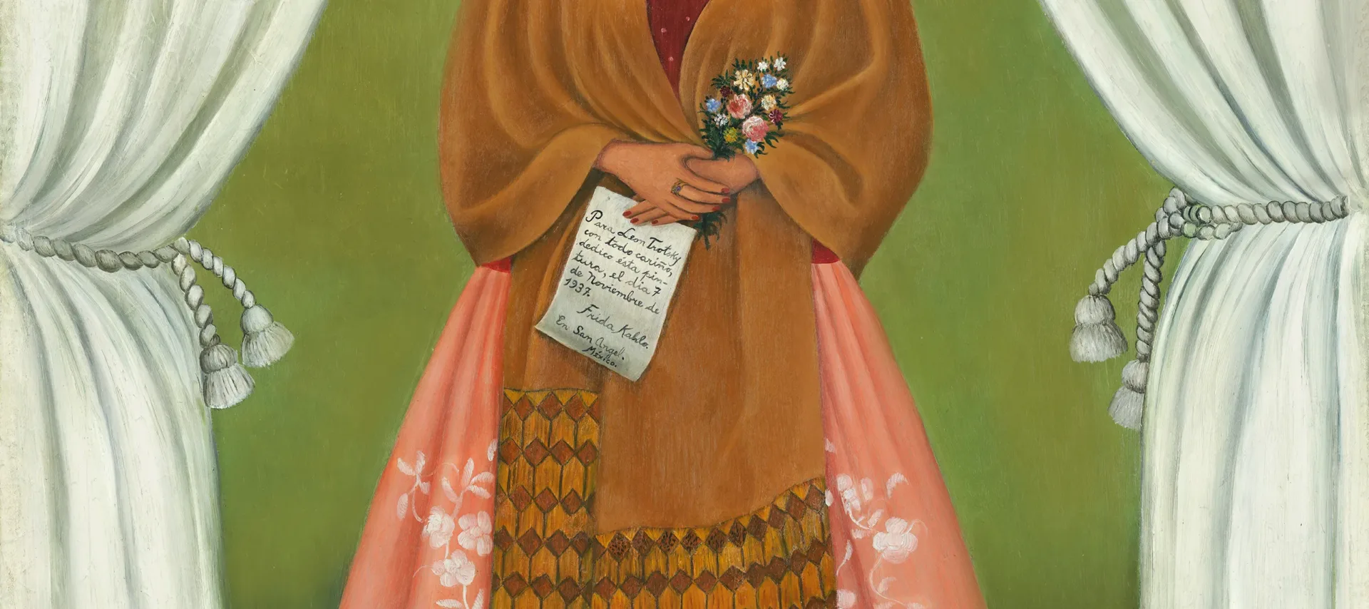 In Self-Portrait Dedicated to Leon Trotsky, Kahlo is framed between two curtains—a new Madonna of the people—wearing traditional Tehuana attire. She holds a letter that is both a declaration of political allegiance and personal affection for the exiled Russian Communist leader Leon Trotsky, with whom she had developed a close friendship and had a brief affair. You can explore the painting in detail on Google Arts & Culture.