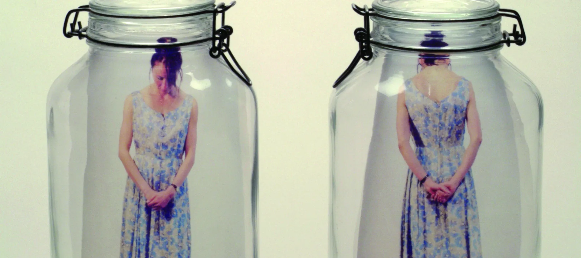 In Preserve (1988), Rector encases translucent photographs of a demure woman—wearing a 1950s-style housedress, clasping her hands, gazing downward toward bare feet—inside sealed glass jars. Through associations like canning to slow food spoilage and capturing creatures for personal enjoyment, Preserve challenges humans’ desire to control time and nature.