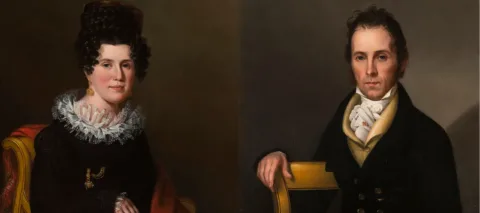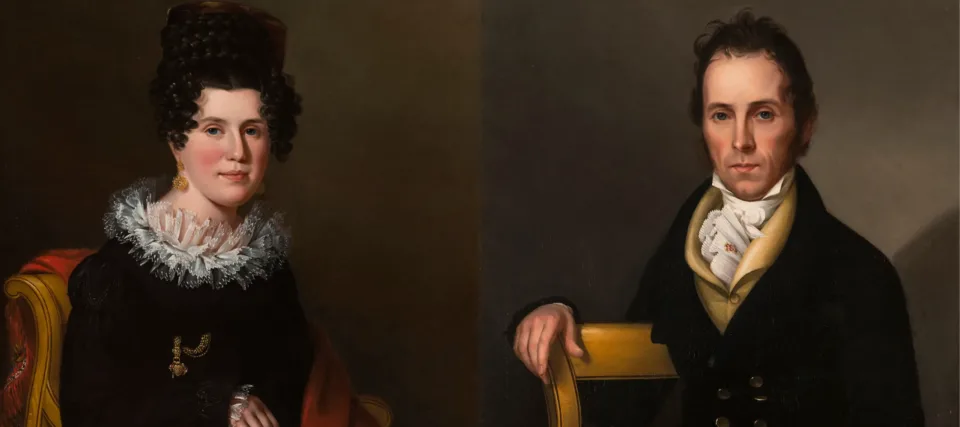 These images of husband and wife Isaac and Susan Avery are termed “pendant portraits” because they were produced to be companions and likely were displayed in close proximity to one another. The paintings are also excellent examples of the artistic skill of Sarah Miriam Peale (1800–1885). Sarah was the youngest daughter of the American painter James Peale and a part of a great family of American painters, including uncle Charles Willson Peale and cousin Rembrandt Peale. Although she began her career as a painter of still lifes and miniatures, (subjects at the time considered well-suited to the sensibilities of women artists), Sarah found success as a portraitist. She exhibited her first portrait at the prestigious Pennsylvania Academy of the Fine Arts in 1818 and six years later she and her sister, miniaturist Anna Claypoole Peale, became the first female members of the Academy.