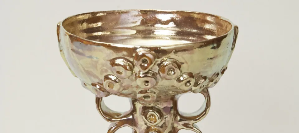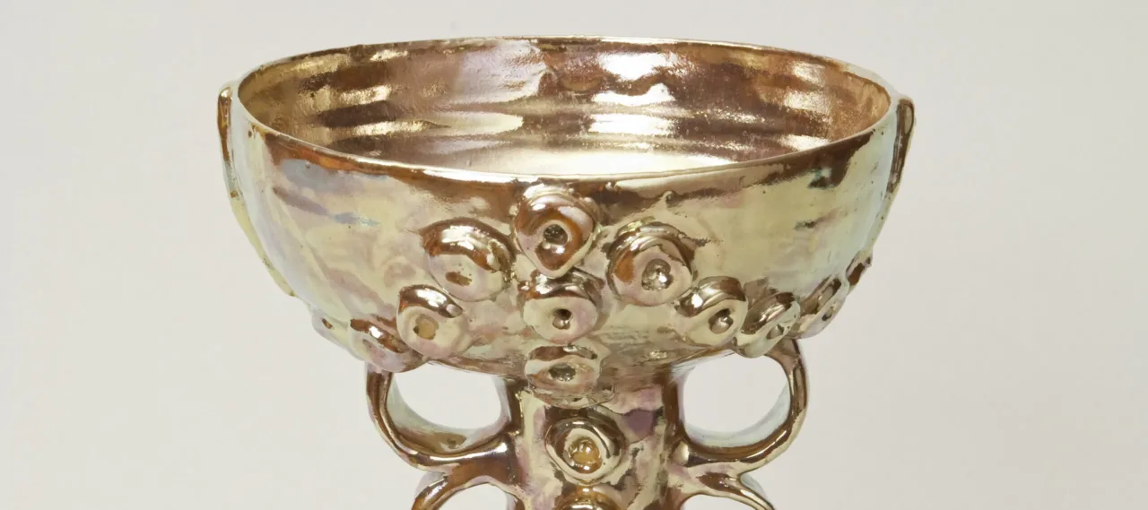 Beatrice Wood (1893 to 1998), known as the “Mama of Dada,” gained renown for her luminous luster-glaze ceramics. Wood discovered pottery classes in the 1930s, when she wanted a matching teapot for a set of teacups from the Netherlands. Her work in ceramics and in creating a signature luster glaze earned her acclaim. Her works were featured in many solo museum exhibitions and fetched high prices at auction. Wood crafted Gold Chalice (1985) when she was 92 years old.