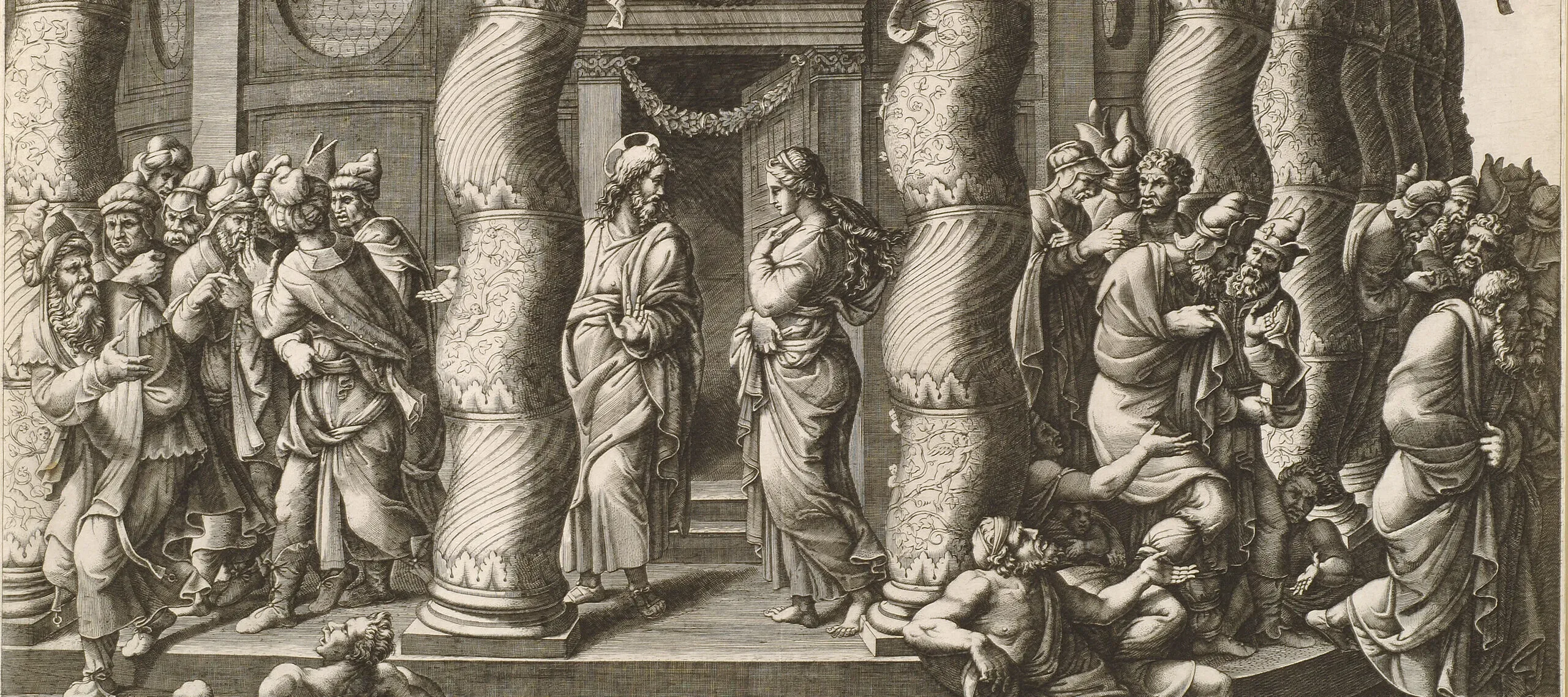 NMWA’s collection contains engravings by both Sirani and Mantuana. Christ and the Woman Taken in Adultery (1575), based on a Raphael tapestry designed for the Sistine Chapel, is one of Mantuana’s most famous prints. In the corner, she dedicated the engraving to Eleonora of Austria and stated her dual allegiance to Rome and Mantua. Two engravings by Sirani, The Holy Family with St. Elizabeth and St. John the Baptist and Madonna and Child with St. John the Baptist, are in NMWA’s collection. In the latter engraving, Sirani stated that it was inspired by Raphael, much like Mantuana’s work.