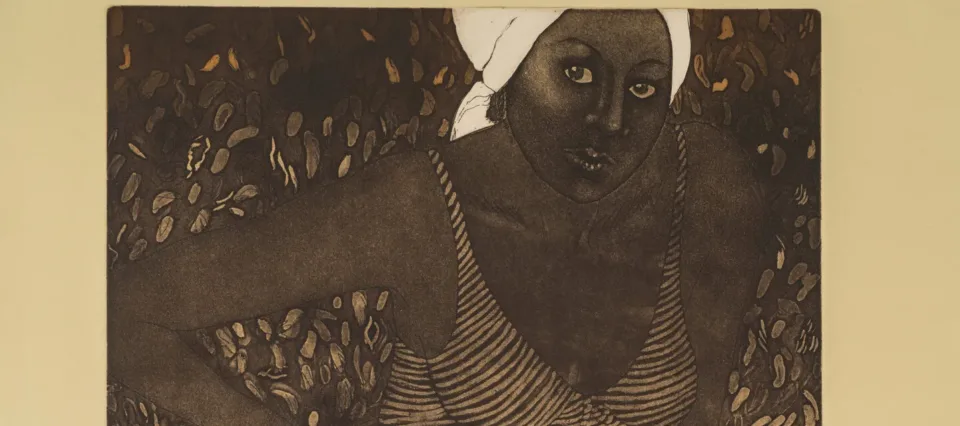 Pool Lady (1980) is Amos’s contemporary take on the bather subject commonly found in art history. She features a Black woman—likely a self-portrait—rarely seen in portrayals of “bathers” in Western art. This confident figure confronts the viewer with a direct gaze and defies stereotypes associated with Black femininity.
