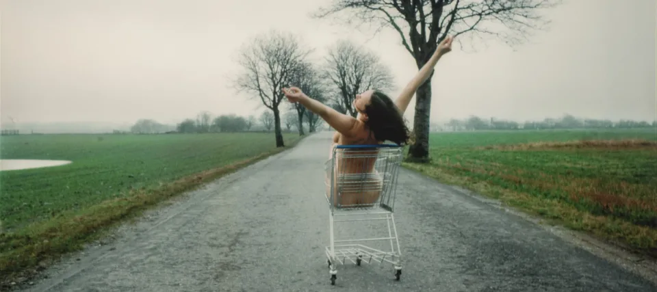 A photograph shows the nude artist sitting in a metal grocery cart. It is located on a paved road in a flat, empty landscape under a gray, misty sky. Her back to the viewer, the light-skinned, brunette woman holds her raised arms in a wide V-shape, suggesting joy or abandon.