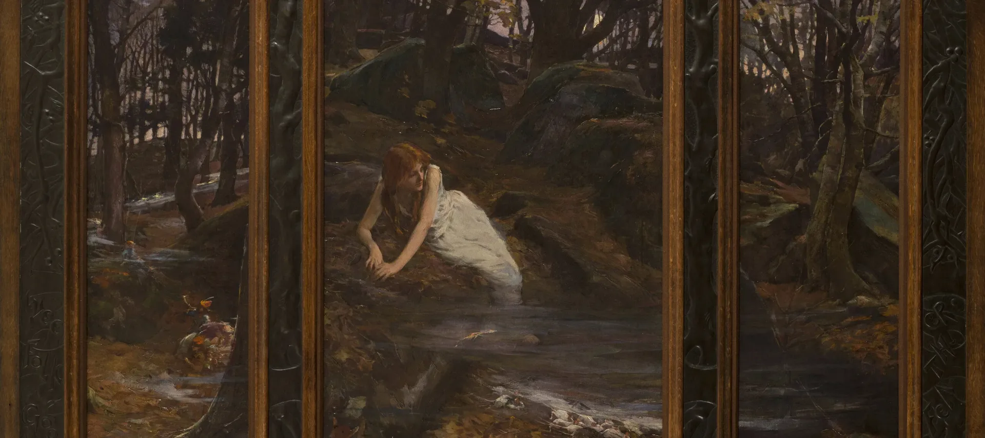 Forbes drew inspiration from William Allingham’s poem The Faeries. The painting’s frame contains a line from the poem among intertwined tree branches: “Wee folk, good folk,/Trooping all together;/Green jacket, red cap,/And white owl’s feather!” In Allingham’s narrative, a young Irish girl named Bridget is kidnapped by the “wee folk,” or “fairies.” After seven years of captivity in the mountains, Bridget returns home and finds all her friends have left. She returns to the fairies, who find her dead the next morning from sorrow. Thinking she is asleep, the wee folk take her “Deep within the lake/On a bed of flag-leaves/Watching till she wake.”