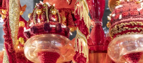 Rubra (Latin for “red”) hangs above viewers in a spectacular display of fiery crimson hues and glowing light. The arts of stitching, sewing, and knitting—traditionally perceived as feminine and domestic—take on a central role in the work. The chandelier features a mélange of handmade wool crochet, lace, sequined fabric, gold tassels, delicate beaded ornaments, and Murano glass. Elongated garlands of sewn fabric dangle at various heights, topped by embroidered crowns. Myriad LED lightbulbs studded throughout the piece create dazzling effects.