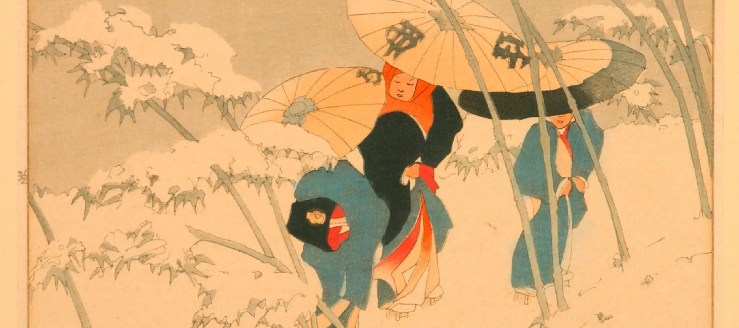 Bertha Lum, a printmaker and illustrator fairly unknown to women’s art history, features traditional Asian motifs and flat lines in her artwork, but with a distinctive style coveted by critics and collectors from both the East and the West. Born in 1869 in Typton, Iowa, as one of four children, Lum was privy to modest beginnings. Between 1895 and 1869 and again from 1901 to 1902 she took courses at the School of the Art Institute of Chicago in figure drawing, design, and illustration. Lum married in 1903 to a wealthy Minnesotan and decided to honeymoon in Japan to satisfy her curiosity for Japanese color woodcuts. While in Japan, Lum purchased low quality woodblock printing supplies and began to produce her own prints when she returned to the United States.