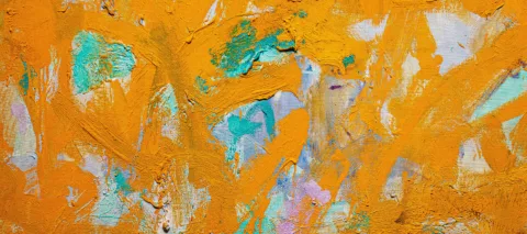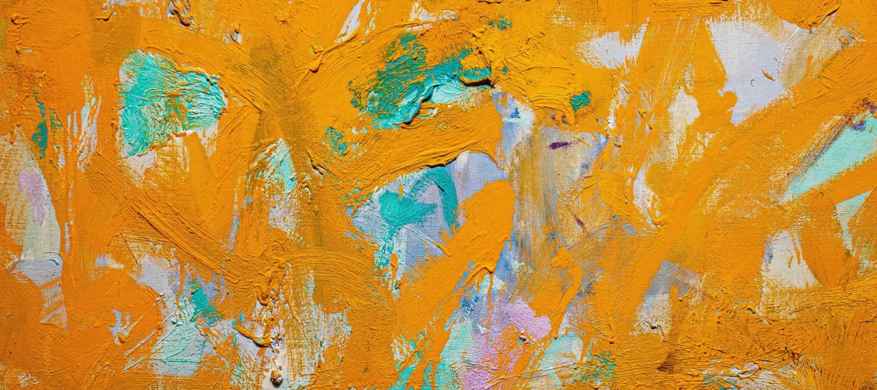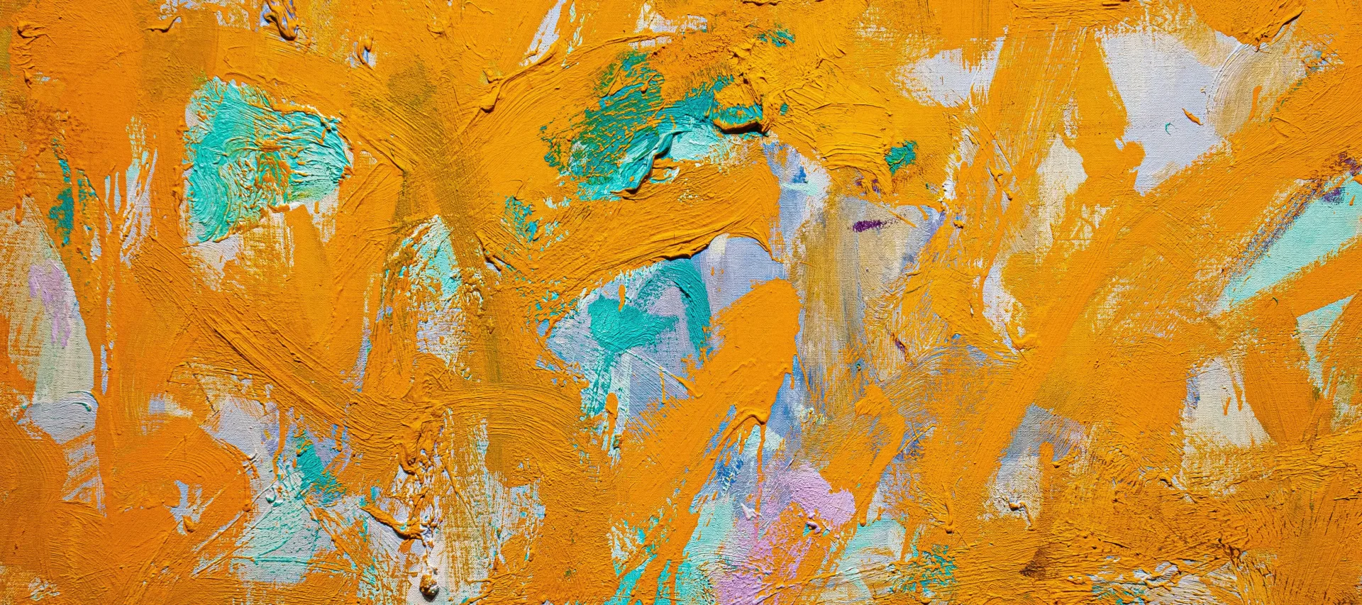 Close-up detail of an abstract painting with very thick and gestural brushstrokes of mostly orange paint.
