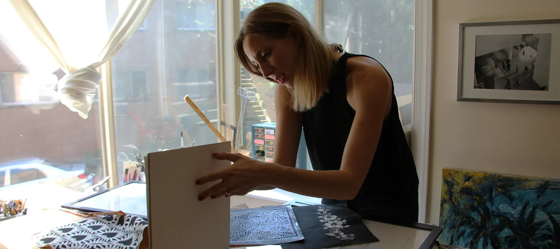 I always start from an original drawing for my patterns. I cut stencils, carve linoleum blocks, and draw very intricate nature scenes. After I have my design, I scan the pattern and edit it in Photoshop. Then the final design is transferred onto a silk screen. I also make all the bags for my designs, which involves cutting fabric or leather, ironing, and sewing.