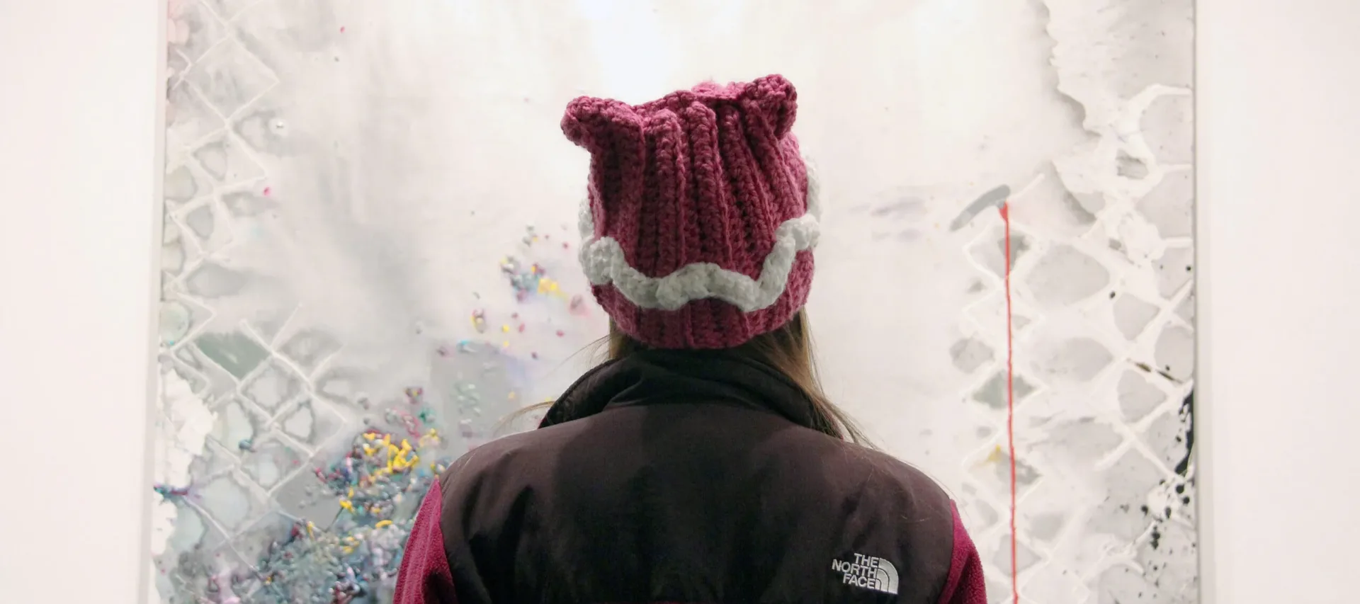 In the dream-like, mixed-media work YARDGUARD (2015), Brenna Youngblood applies an array of colors, tones, and patterns to create a nuanced composition. In the six-foot-high painting, the artist challenges viewers to make connections and open their imaginations.