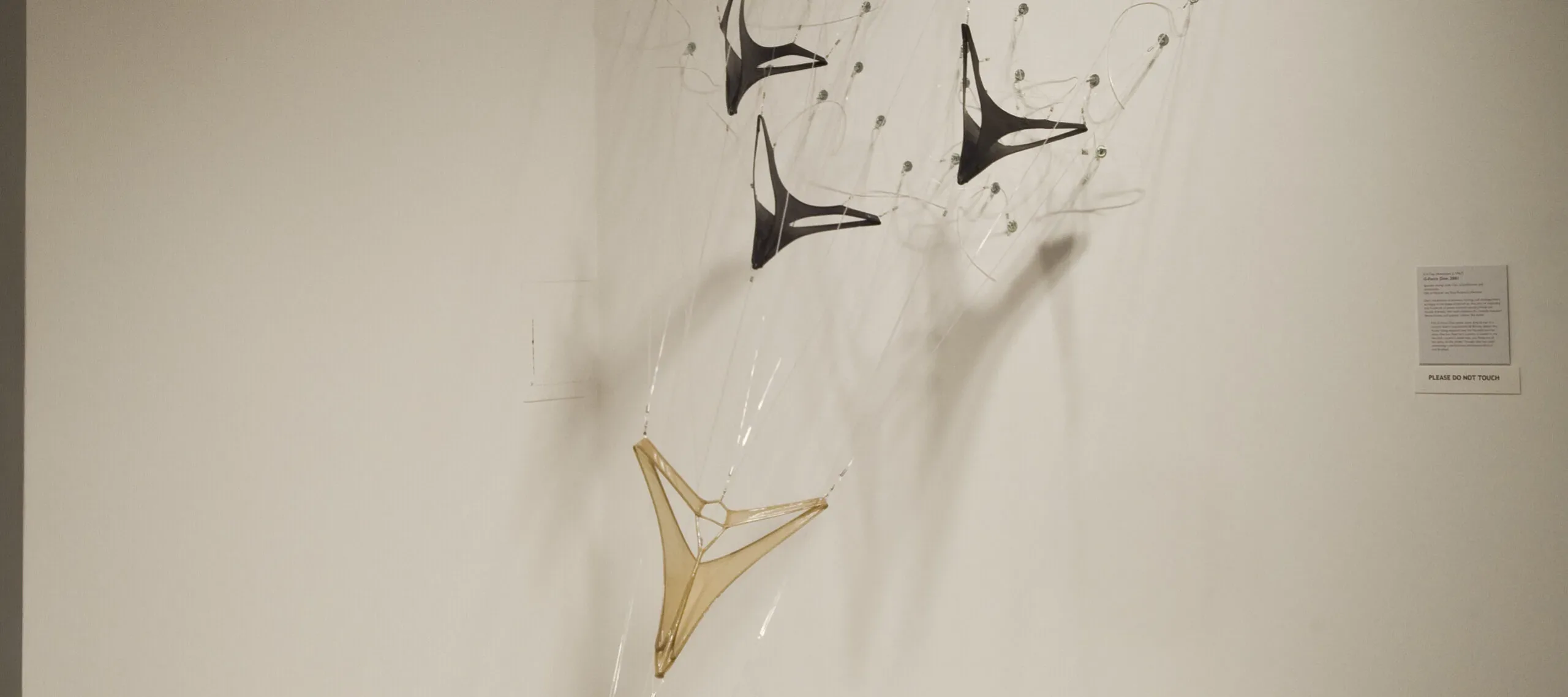 A sculpture made made from spandex and objects resembling military planes flying down towards the ground.