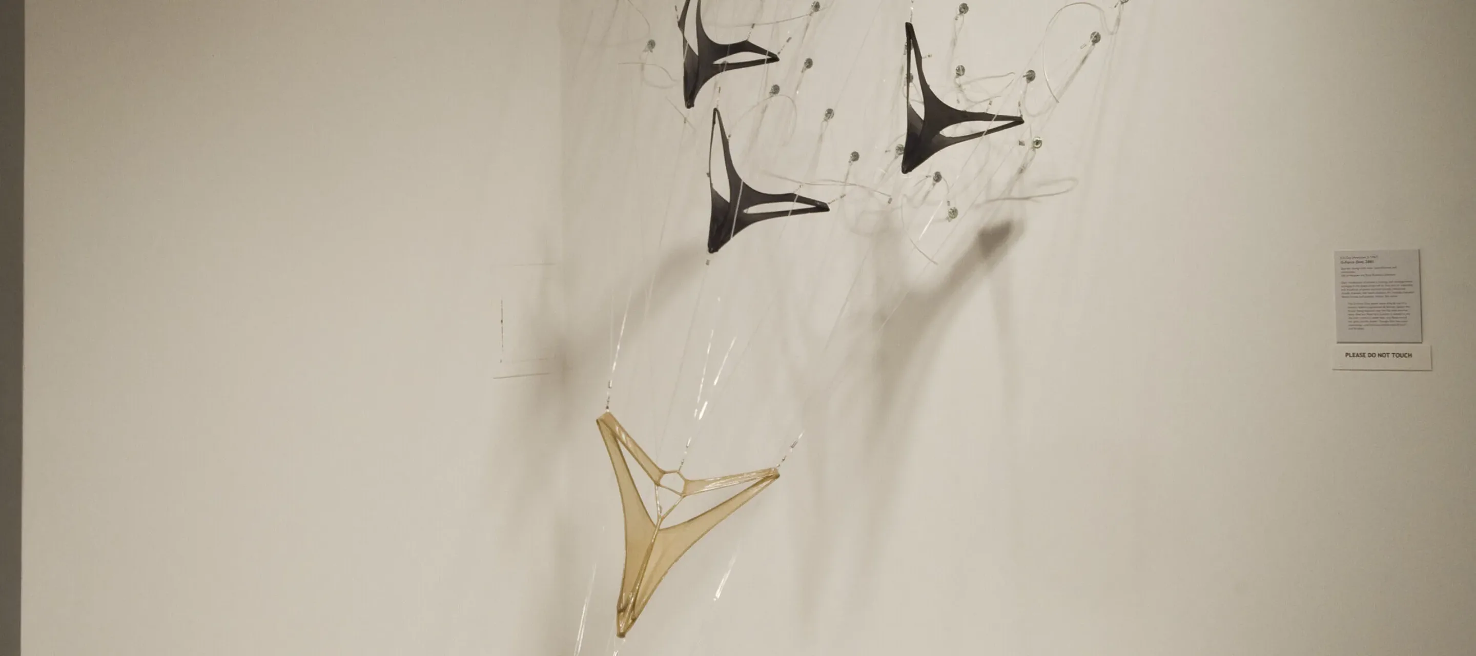 G-Force Dive, part of the “G-Force” series, is an installation of one nude-colored thong and three black thongs suspended by a monofilament fishing line and mounted with turnbuckles. The stretched thongs maintain their shape with resin and are all pointed downward in the same direction. The dynamic push-and-pull effect creates a forceful tension that is reminiscent of military aircraft and masculine high technology.