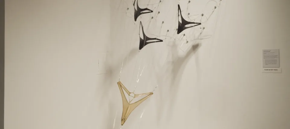 Close-up of a sculpture made made from spandex and objects resembling military planes flying down towards the ground.