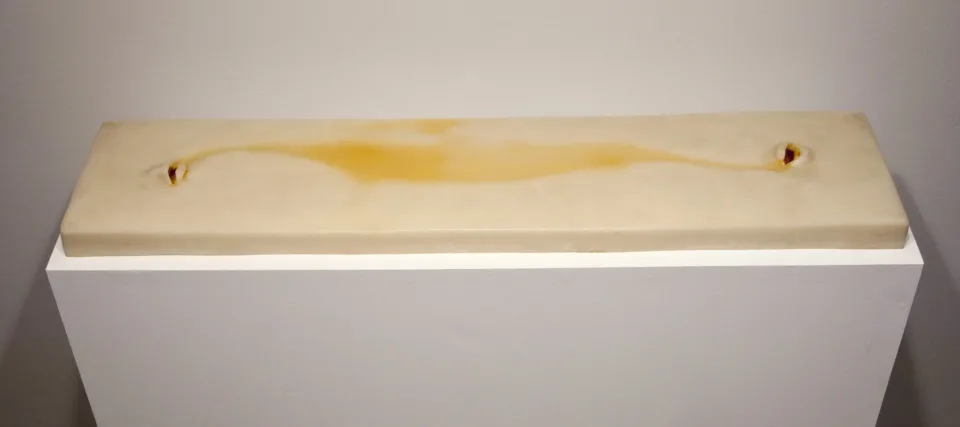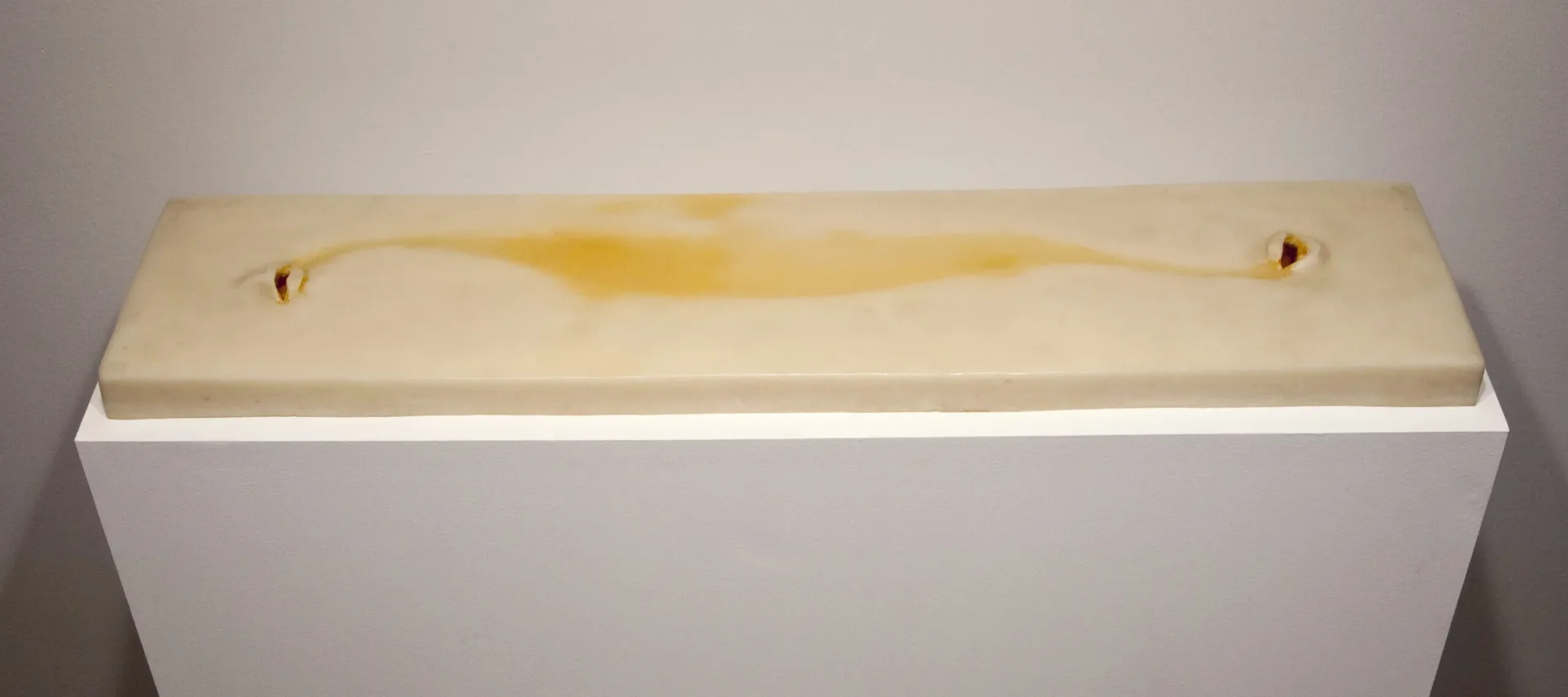 Brazilian sculptor and installation artist Valeska Soares investigates multi-sensory approaches and how memory and personality influence the viewers’ perception of art. Soares has two artworks in P(art)ners: Gifts from Heather and Tony Podesta, on view through March 6. In Untitled (from Entanglement series), Soares creates both an olfactory and a visual experience. She carved two highly naturalistic mouths that each reveal a tongue and teeth, although their gender is unclear. Perfumed oil flows across the top of the wax slab from one mouth to another. Her other work, Untitled (from Vanishing Point series), employs mirrors to create a distorted view, evoking an imaginative and daydream-like quality.