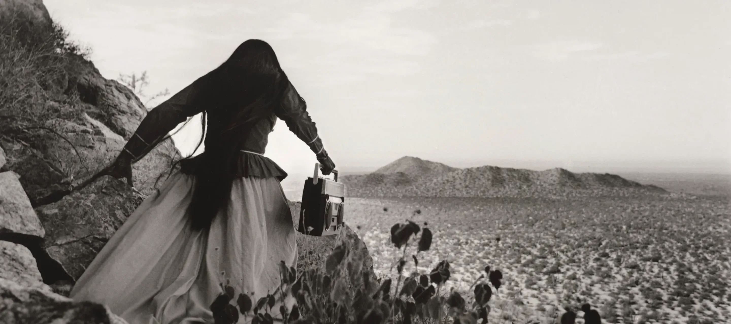 This photograph presents a seemingly contradictory image. A woman in traditional Seri dress walks down to the empty desert plain holding her boom-box, a reminder of the technological and material influence of the United States on her indigenous culture. The title transforms the figure into a celestial being: we cannot see her face, and she appears to be floating into another realm, arms spread and hair blowing in the wind.