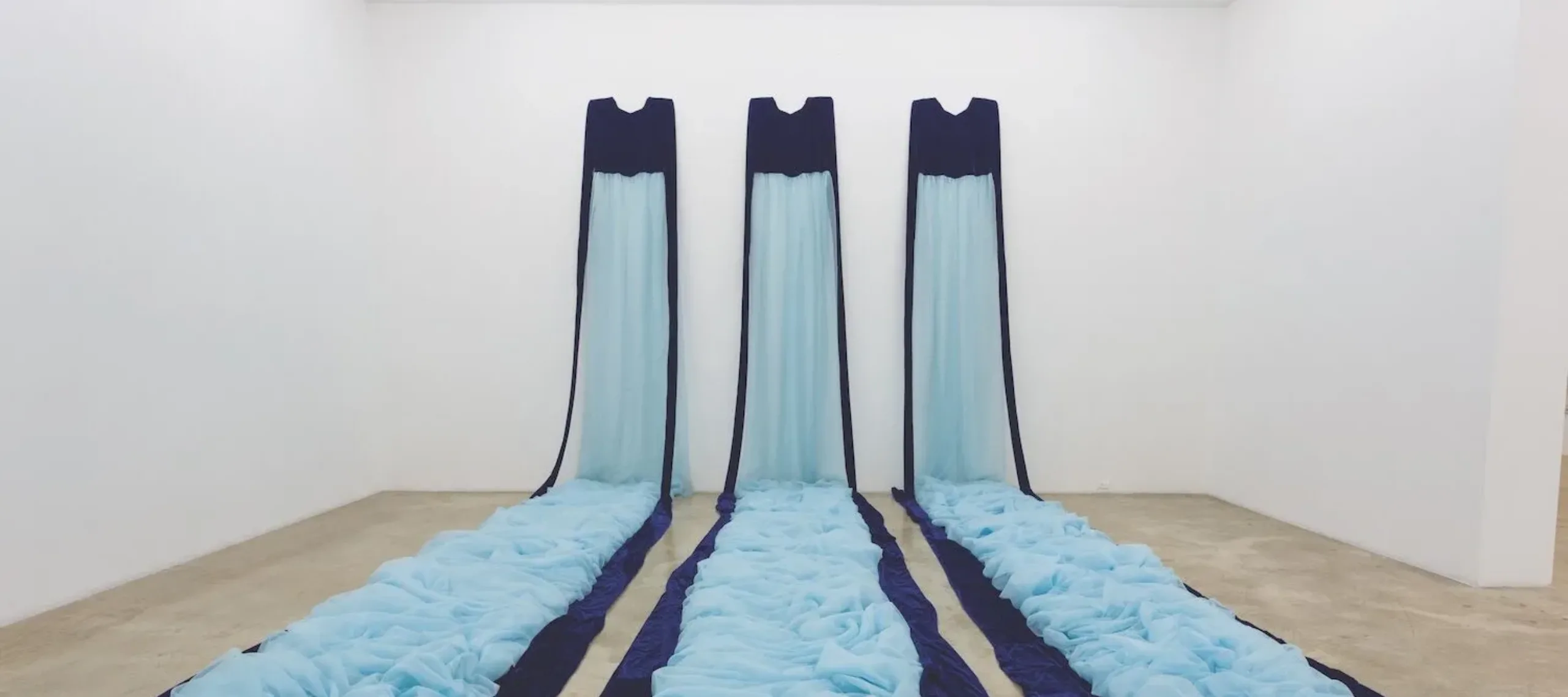 Created using chiffon and crushed velvet, Beverly Semmes’s Blue Gowns (1993) aggressively fills a gallery in Revival. Pinned to the wall and flowing onto the gallery floor, these three over-sized dresses resemble cascading waterfalls or female bodies expanding in space. This relationship between the body and the landscape is further enhanced by the texture of the materials.