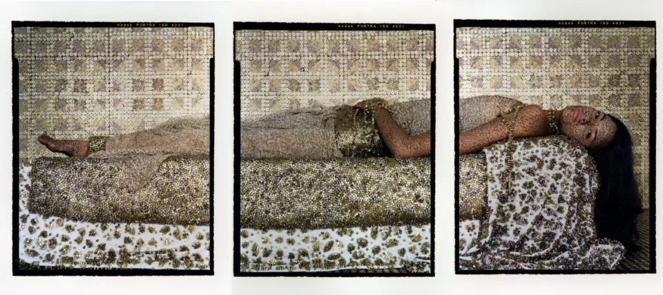 In the triptych from the series Bullets Revisited #3 (2012), Lalla Essaydi portrays a reclining woman with her face turned toward the viewer, confronting the historical Orientalism of Western artists, particularly sexualized depictions of women. Upon a closer look, the viewer will notice that the figure’s body is covered in henna calligraphy, challenging the tradition of calligraphy as a male-dominated art form. The woman’s dress and surroundings are elaborately decorated with silver and gold bullet casings. Essaydi explains her use of bullet casings as a commentary on violence against women in a new post-revolutionary era following the Arab Spring.