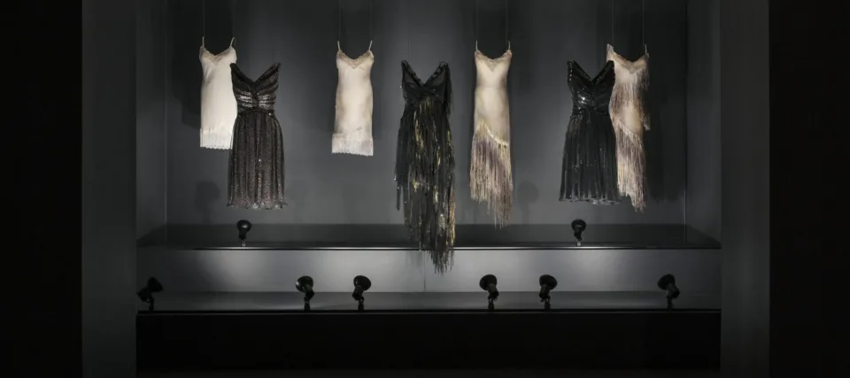 In both cases, the artists used delicate materials to convey grief and depression. Niffenegger used Gampi tissue paper, silky and translucent, to form the flowing skirt in her piece—perhaps also referring to the fact that even in her anguish, Blow was always dressed elegantly. The Mulleavys worked with silk crepe, lace, and chiffon to create Theresa’s black-and-white dresses. They colored the white dresses with mauve and beige so that they appear bruised over time, communicating Theresa’s sadness and isolation.